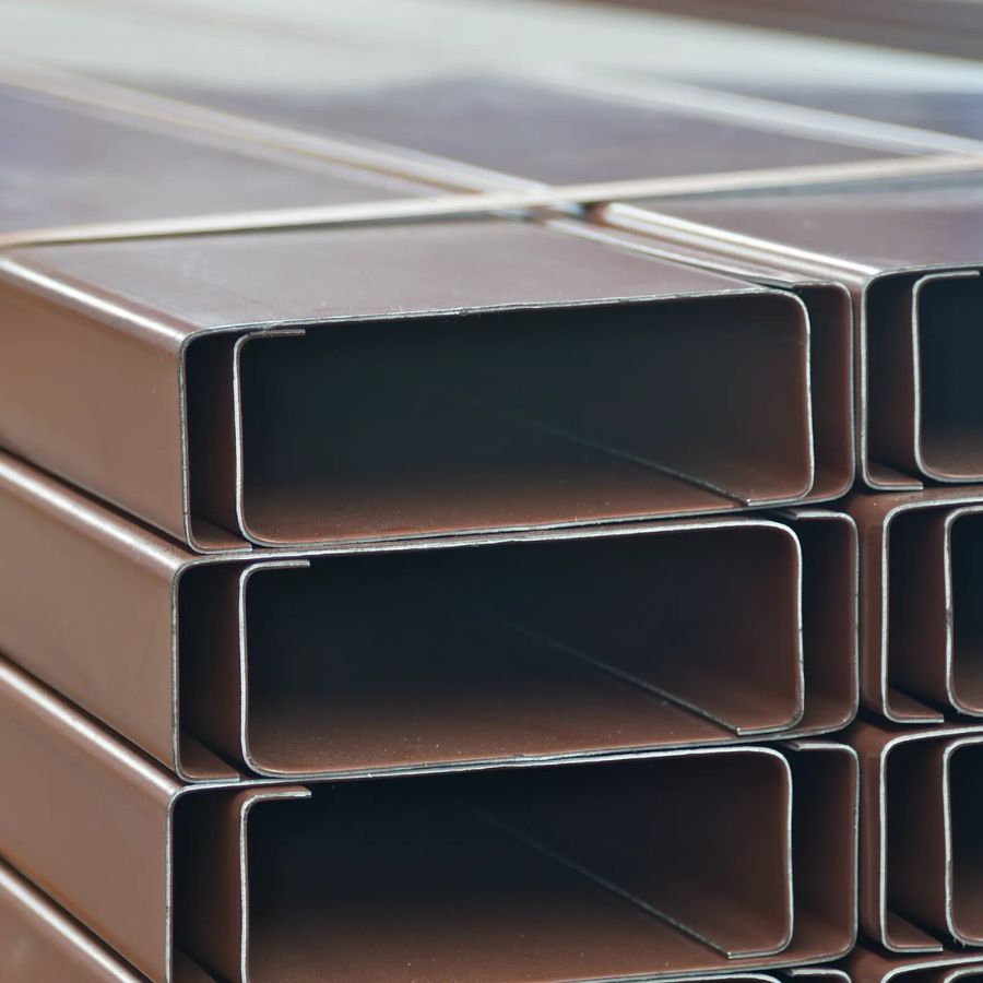 Perfiles de acero estructural tipo C, cuadrados y rectangulares, utilizados en la construcción de techos y estructuras metálicas.